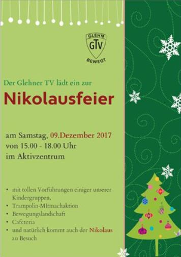 Der Glehner Turnverein läd zu seinem traditionellen Nikolausturnen ein – mit viel Geselligkeit, Bewegung, Unterhaltung und natürlich mit Kaffee, Waffeln und Kuchen.