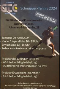 « Alle Veranstaltungen Diese Veranstaltung hat bereits stattgefunden. Schnupper-Tennis 2024 20. April 2024 - 10:00 - 15:00 « Das große Aufräumen 2024 Party 100 Jahre SV Glehn » + Google Kalender+ Zu iCalendar hinzufügen Details Datum: 20. April 2024 Zeit: 10:00 - 15:00